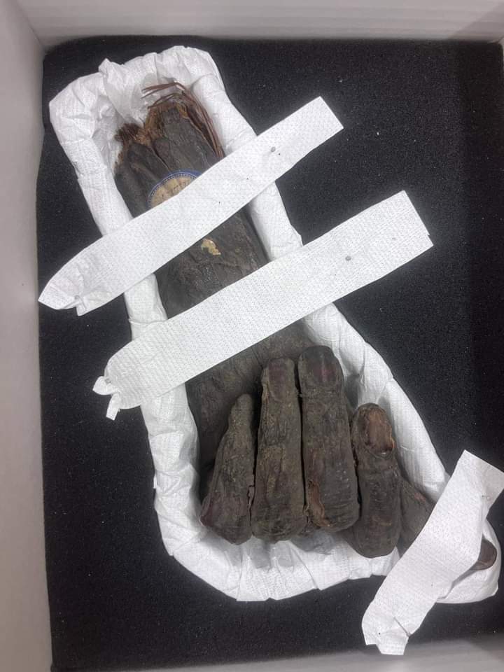 وأوضح السيد شعبان عبد الجواد مدير عام الإدارة العامة لاسترداد الآثار والمشرف على الإدارة الرئيسية للتأثيرة المنافذ، أن القطع المستردة الملونة بمشاركة يد ورأس لمومياءة بالذهب، كانتا معروضتان في متحف الفن في مدينة هامبورغ منذ أكثر من 30 عامًا وبعد الكشف عليهما حاليًا، وأن عمرهما يزيد عن ألفي عام قبل وأنهما يعودان للحضارة المصرية القديمة، ومازالت ملابس وصولهما إلى ألمانيا غير معروفة. أما التميمة فتعود 600 قبل كل شيء للتحكم في سلطات الرقابة قد تمارس بمصادرها عند محاولة إدخالها بشكل غير صحيح من بريطانيا.