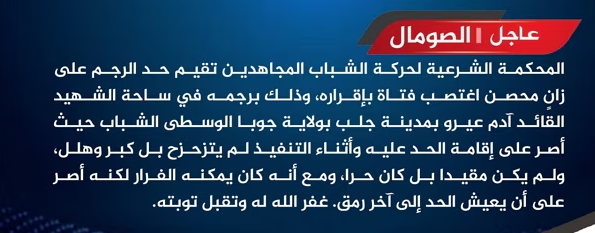 حركة الشباب المرتبطة بالقاعدة تنفّذ حكم الرجم حتى الموت بحق مُدان بالاغتصاب وتصفه بـ"التائب"