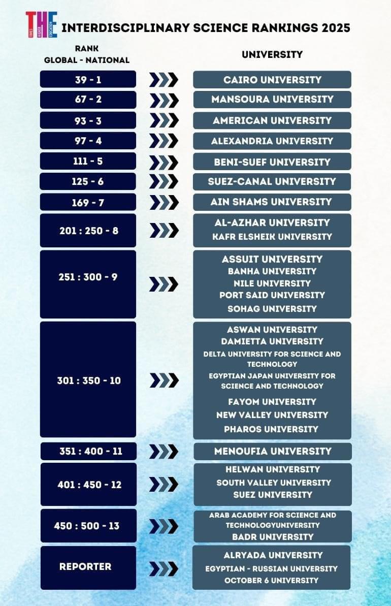 التعليم العالي تشارك في جلسة نقاشية حول الابتكار في دول العالم الإسلامي ضمن فعاليات ( COP29) وزير التعليم العالي يشهد توقيع بروتوكول تعاون مشترك بين جامعة بنها ومحافظة القليوبية ومستشفى الناس الدكتور مصطفى مدبولي يتفقد جناح وزارة التعليم العالي على هامش افتتاحه للمعرض التعليم العالي تعلن أعداد الطلاب المُتقدمين لانتخابات الاتحادات الطلابية للعام الجامعي 2024/2025 وفد اللجنة الوطنية المصرية للتربية والعلوم والثقافة يشارك في قمة المعرفة 2024 في دبي توقيع خطاب نوايا بين جامعة المستقبل وجامعة إيست إنجليا البريطانية أكاديمية البحث العلمي والتكنولوجيا تشارك في جلسة مع المنظمة العالمية للملكية الفكرية محافظ أسوان يناقش استعدادات المبادرة بجامعة أسوان وزير التعليم العالي يبحث سُبل التعاون مع شركة سيمنز هيلثنيرز للشرق الأوسط إدراج 27 جامعة مصرية في الإصدار الأول لتصنيف التايمز للتخصصات البينية